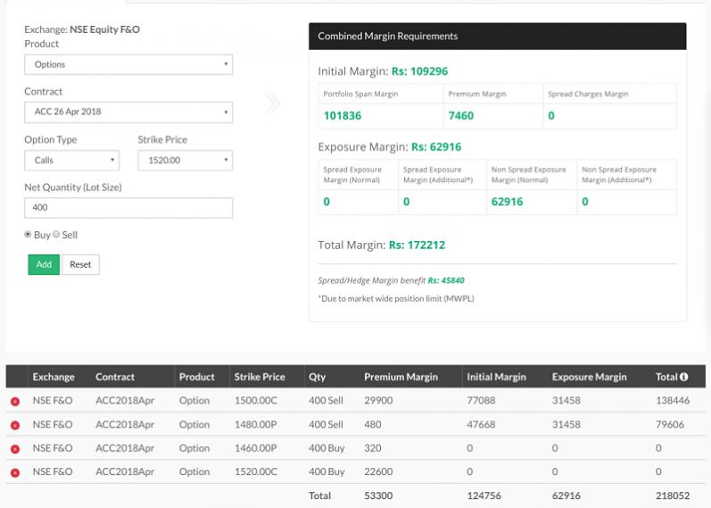Let’s take an example of a calendar spread between selling one lot of ACC April 2018 expiry and Buying one lot of ACC may 2018 Expiry Future. The calculator allows adding two positions and shows the detail margin requirements.